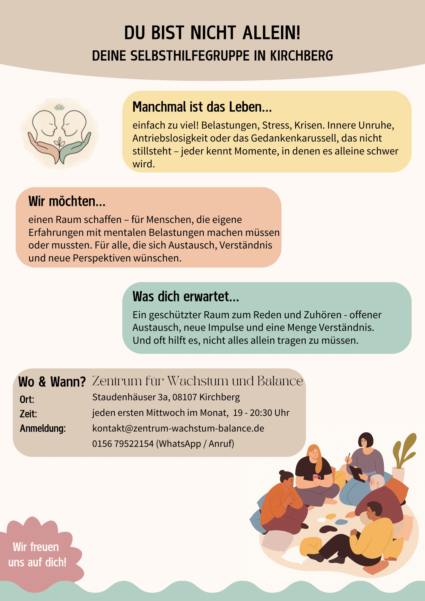 In unserer Gruppe triffst du Menschen, die ähnliche Erfahrungen machen oder gemacht haben. Der Austausch auf Augenhöhe kann entlasten, neue Sichtweisen eröffnen und das Gefühl stärken, nicht allein zu sein.